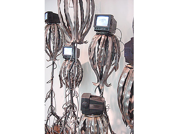 The forest of hand-forged steel plants are fused with technology; the heads of the pants are moving monitors with video images of human eyes. The eyes randomly scan the environment, and when the hidden motion sensors detect movement, the eyes lock on the visitor.